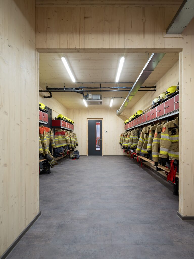 “De gemeente had er belang bij dat het nieuwe gebied naast de oude brandweerkazerne zo snel mogelijk doorontwikkeld zou worden. Eisen voor de kazerne waren: functioneel, sober en doelmatig. En de levensduur van de kazerne moest minimaal 40 jaar zijn. Al snel bleek dat zowel ik als Geert – collega van Bettina – de voorkeur gaven aan houtbouw”, vertelt Kevin. Behalve geen gedoe met stikstof, de duurzame waarde van credits door de CO2 opslag in al het hout, de complete demontabelheid van het gebouw, was vooral de snelle bouwtijd van doorslaggevend belang. In 10 dagen tijd is het hele gebouw neergezet. “Om de 2 dagen kwamen de geprefabriceerde 2D CLT-elementen met vrachtwagens naar de bouw. Van te voren was de betonnen funderingsvloer gestort. En natuurlijk heb je dan ook de afwerking nog. Maar ook dit ging razendsnel. Omdat de hele bouwmethode veel gestroomlijnder, schoner en droger in elkaar zit, kunnen er gelijktijdig veel vaklieden binnen aan de gang met bijvoorbeeld de installaties en afwerking van ruimtes. Op een gegeven moment waren er zelfs 25 vakmannen binnen bezig. Dat is ook de enige overlast die de buurt heeft gehad” grapt Kevin. “Al die busjes die geparkeerd stonden.”