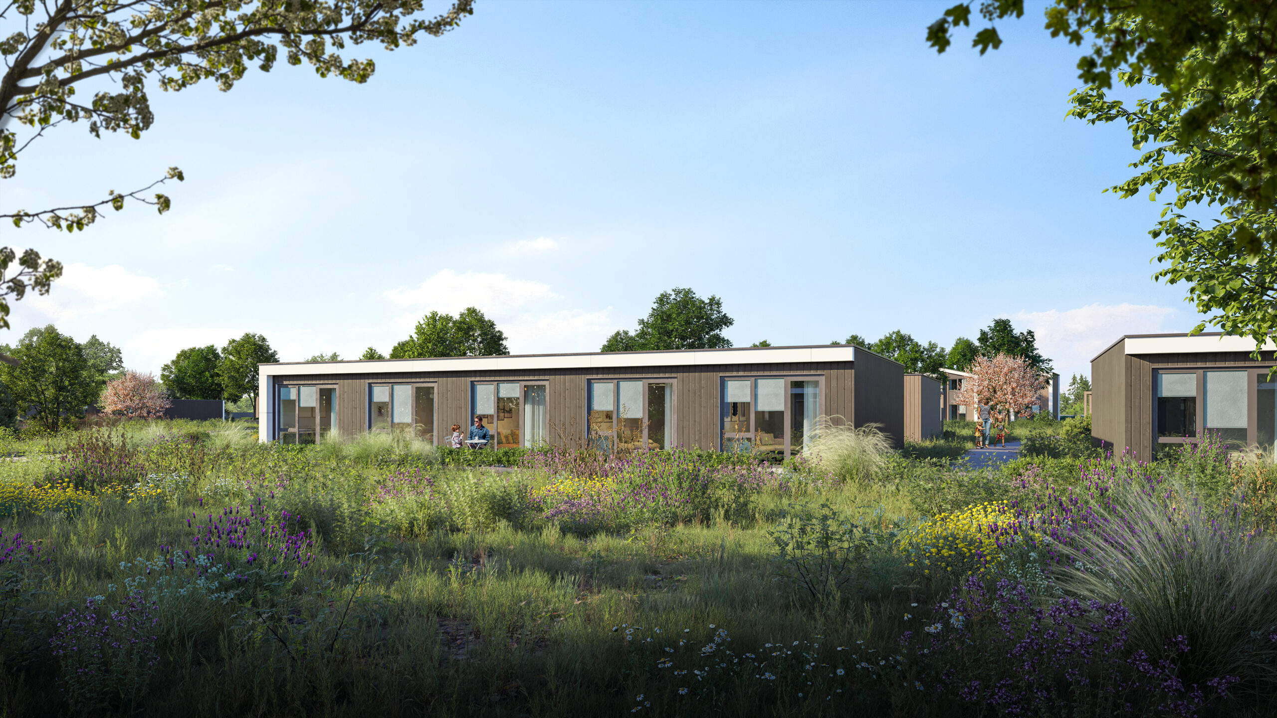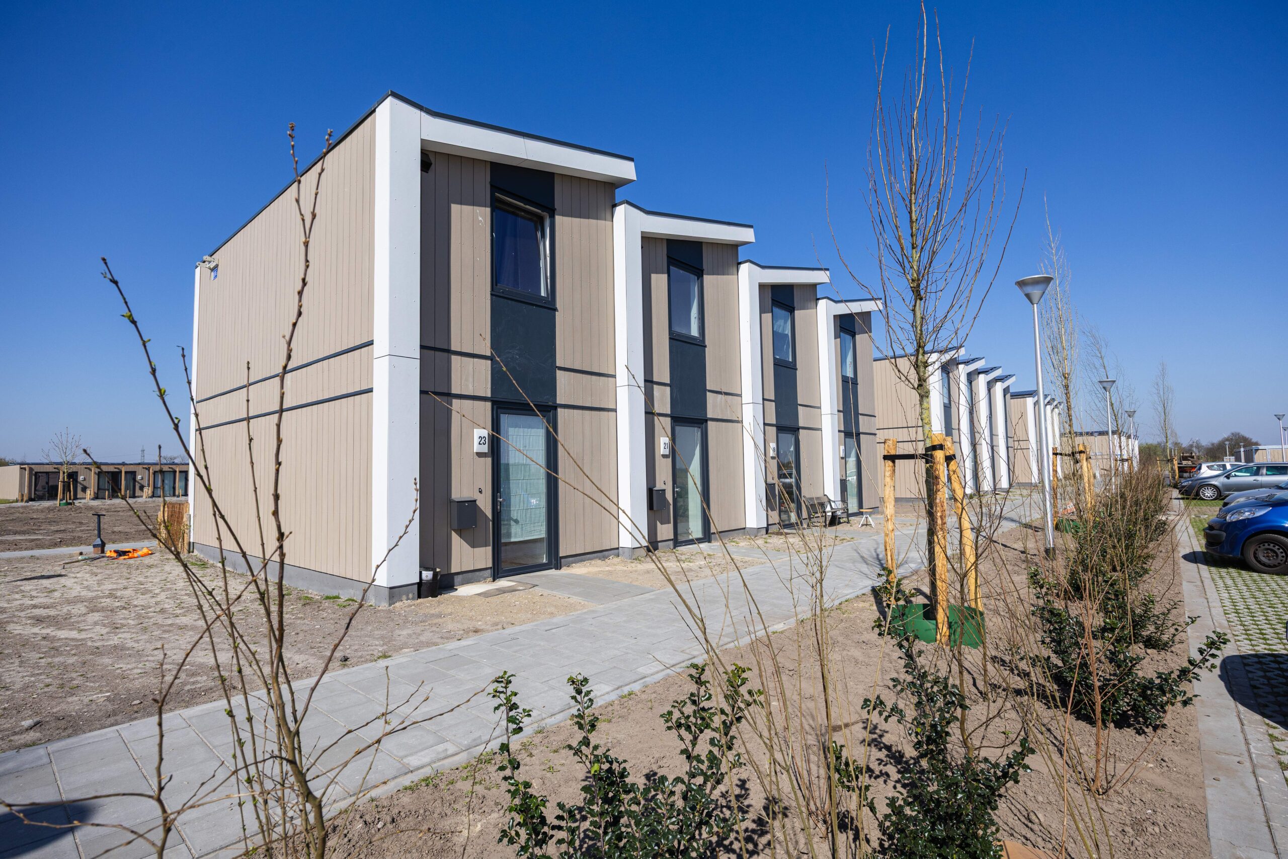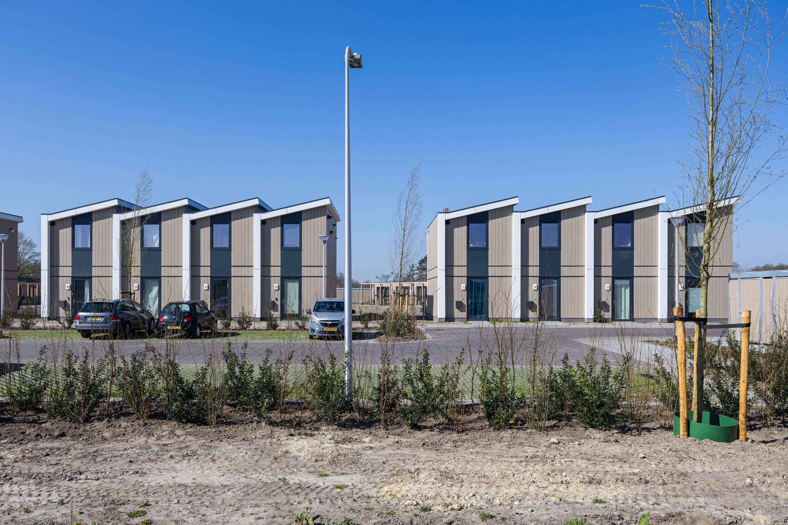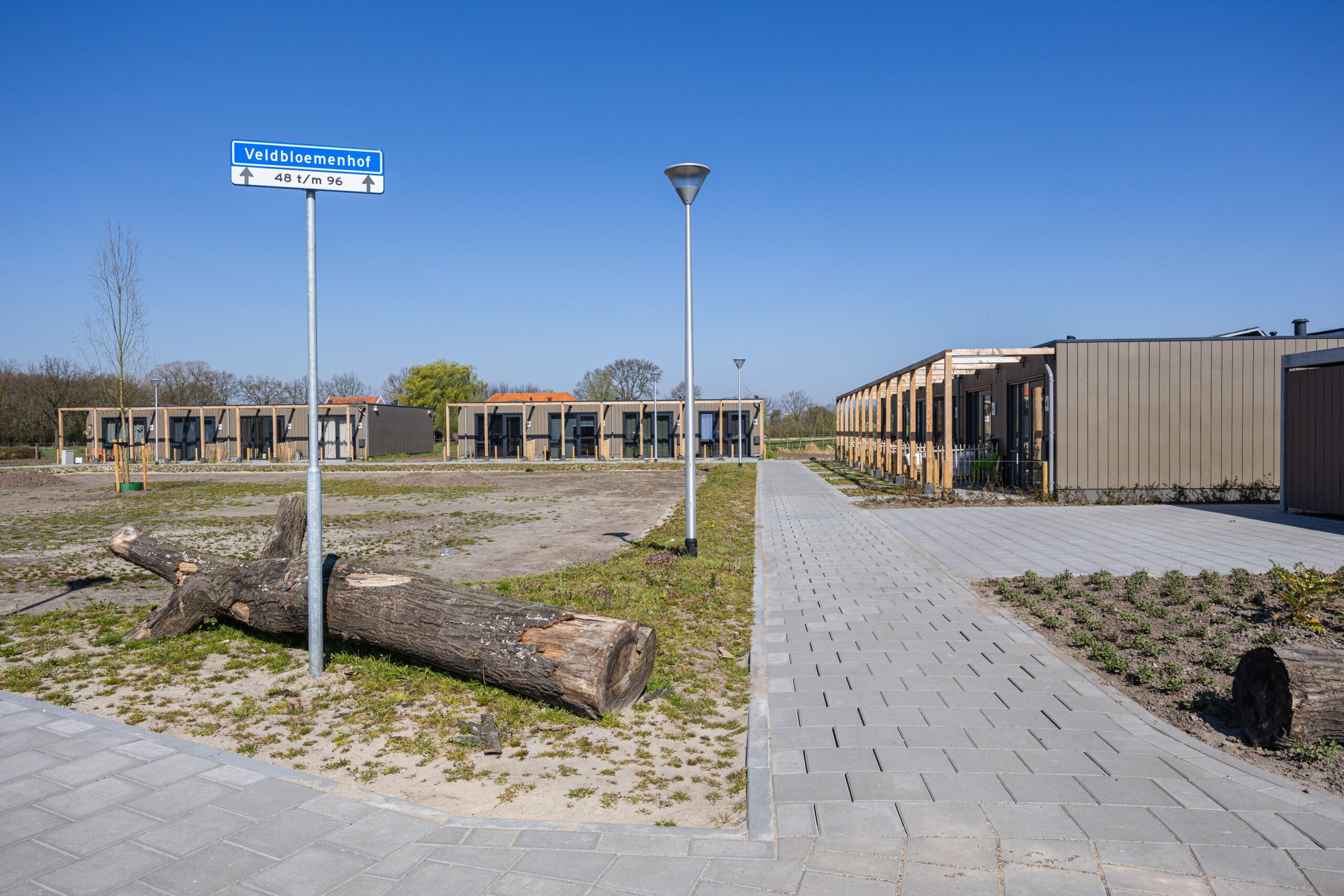 In de autoluwe woonbuurt Veldbloemenhof staan 80 begane grondwoningen en 20 woningen met 2 verdiepingen, allemaal met een sociale huurprijs. De modulaire woningen zijn van houtskeletbouw en staan er tijdelijk als voorloper op de nieuwe duurzame woonwijk Haansberg. In drie weken tijd zijn alle 100 woningen geplaatst. Supersnel dus! Dat is echt het voordeel van de modulaire houtbouwmethode van woningen die in de fabriek geprefabriceerd worden met een kwaliteit die volledig voldoet aan de BENG-norm.